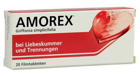 Take a look at what we came across: a supplement, from Austria, called Amorex and on the box it says it helps against a broken heart. In German, of course: "Bei Liebeskummer und Trennungen". Active ingredient: an extract of Griffonia simplificolia.