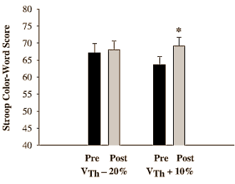 On one occasion the students cycled at moderate intensity: 20 percent below their ventilatory threshold [point at which they would start to pant] and at 56 percent of their maximal oxygen uptake [VTh-20%]. On the other occasion the students cycled more intensively: at 10 percent above their ventilatory threshold at 75 percent of their maximal oxygen uptake [VTh+10%].