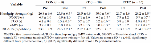 The subjects in the strength training + supplementation group not only trained with weights, but also took 3 capsules with fish oil every day. [RTFO] Each capsule contained 700 milligrams of EPA and 240 milligrams of DHA. The subjects took a capsule for breakfast, a capsule for lunch and a capsule for dinner.Results
