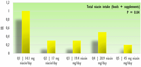 The relationship between total vitamin B3 intake and Alzheimer's disease was, ehm, meh. The study participants who consumed a relatively large amount of B3 had less chance of Alzheimer's, but the effect was not overly strong. The effect of the intake of B3 from regular foods was significantly more convincing.