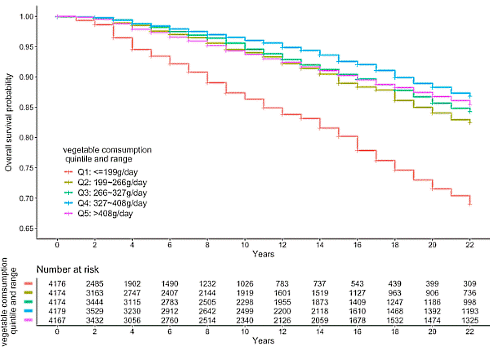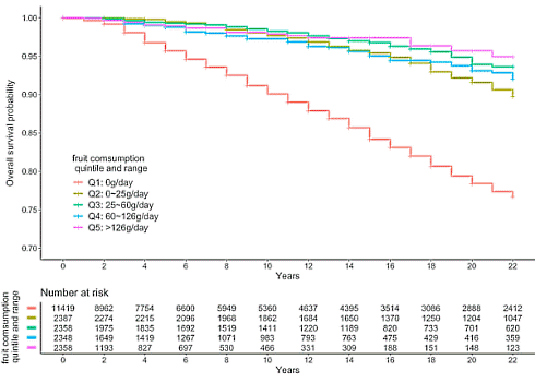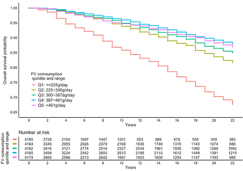 On the basis of their intake of vegetables, fruits and vegetables and fruit together, Gu was able to divide the study participants into 5 groups of approximately equal size. Gu then determined the relationship between the risk of death and the risk of death.