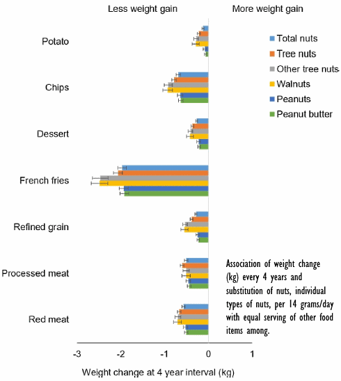 According to the figures below, the study participants became slimmer primarily when they replaced fries and chips with nuts. Not surprisingly, indeed.