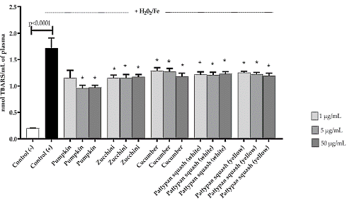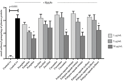 The figure above shows that most extracts also inhibit the increase in plasma protein carbonyls, whichs more or less equals burnt or oxidized protein. In this case, pumpkin extract performed best. At a concentration of 5 micrograms per milliliter, pumpkin worked better than the other extracts.