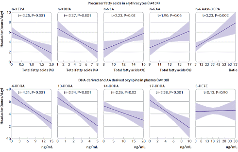 The opposite was true for omega-6 fatty acids [LA, AA]. The higher the concentration, the more hours of headache the subjects reported.