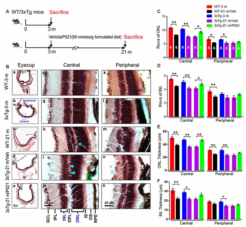 “We found that rows and thickness of ONL were all significantly decreased in the central retina in WT-21 m/Veh and 3xTg-21 m/Veh mice and that these changes in the central retina were prevented in 3xTg-21 m/P021 mice (Figures 3B,C,E). In the peripheral retina there was a significant decrease in rows and thickness of ONL in WT-21 m/Veh and only in the thickness but not in rows of ONL in 3xTg-AD-21 m/Veh, and P021 treatment showed a trend to rescue these changes (Figures 3C,E). Rows and thickness of INL in the central retina were also decreased in WT-21 m/Veh and 3xTg-21 m/Veh mice, and chronic treatment with P021 prevented these changes in 3xTg-21 m mice; although there was an obvious trend, the rescue of INL thickness by P021 treatment did not reach statistical significance (Figures 3B,D,F). The age-associated changes in rows and thickness of INL in the peripheral retina were smaller than those seen in the central retina, and their prevention by chronic treatment with P021 did not reach significance in 3xTg-21 m/P021 mice (Figures 3B,D,F). In addition, the nuclei of ONL in the central retina were extended across the OPL or protruded into the INL in the WT-21 m/Veh and 3xTg-21 m/Veh mice, which made the gap between the ONL and the INL narrower or unclear (Figures 3Bh,i), whereas this pathology was prevented in 3xTg-21 m/P021 mice (Figure 3Bj).”“Altogether, these findings indicated the degeneration of both the ONL and the INL in the central and peripheral retinas in WT/Veh and 3xTg/Veh mice at 21 months of age, and the prevention of these changes, especially in the central retina, by chronic treatment with P021 in 3xTg-AD mice.”