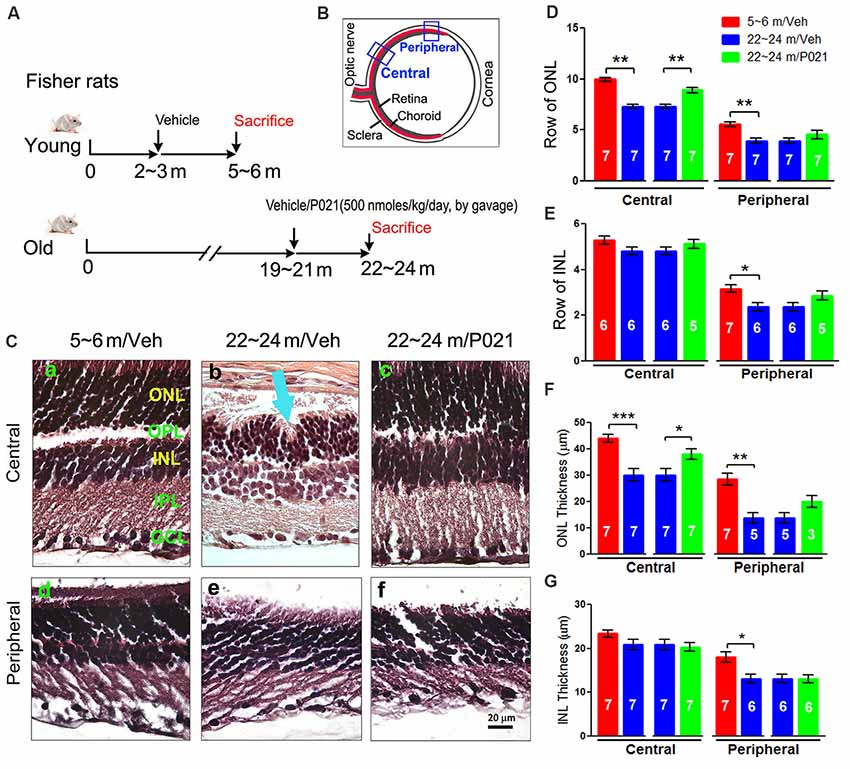 "(B) Schematic diagram showing the sections of the rat eye employed in the study. (C) Representative images of the central and peripheral retinas showing the morphology of retinal layers, H & E staining in 5-μm sagittal paraffin sections (Ca–f). Rosette-like rearrangements of photoreceptor cells that extend from the ONL and across the OPL toward INL (Cb), and photoreceptor inner segments (ISs) that project inward to form the core of the rosette (blue arrow) were found in ~22- to 24-month-old vehicle rats. (D–G) Quantification of rows and thickness of the ONL and INL in central and peripheral retina (n = 3–7 rats; exact “n” values are labeled in each bar)."
