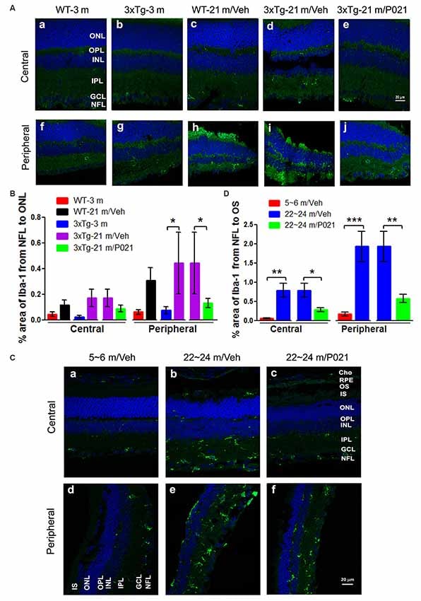 “In AMD, activated microglia are localized in the ONLs where they are associated with photoreceptor degeneration, apparently for the removal of cell debris. We used Iba-1 immunofluorescence to study microgliosis in the retina of aged mice and rats.”“Interestingly, the Iba-1 immunostaining in 3xTg-21 m/Veh mice was significantly higher than in WT-21 m/Veh mice, whereas it was decreased in 3xTg-21 m/P021 mice to the levels in WT-3 m/Veh and 3xTg-3 m/Veh mice in the peripheral retina (Figure 5B), even though there was no obvious difference in the distribution of Iba-1–positive staining (Figures 5Af–j).”