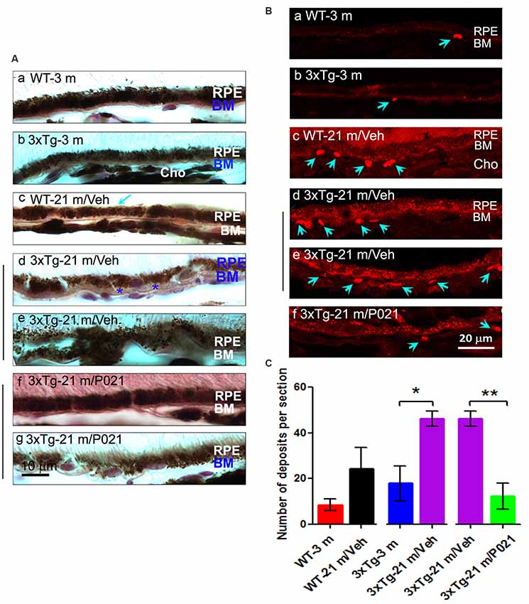“Disruption and degeneration of RPE are well known to occur in AMD. We, therefore, investigated the occurrence of this pathology in both aged WT and 3xTg-AD mice and the effect of chronic treatment with P021 on its prevention. We found that the areas with the greatest photoreceptor disorganization were often associated with atrophied RPE and increases in lipofuscin granules in the central retina in 3xTg-21 m/Veh mice (Figure 3Bi). The central retina in WT-21 m/Veh and 3xTg-21 m/Veh mice showed multiple additional AMD features, including hypo-pigmentation, thinning, and disorganization of RPE (Figures 3Bi, 4Ad,e). RPE in 3xTg-21 m/Veh mice also showed frequent accumulation of large lipofuscin granules (Figures 3Bi, 4Ae). We found an increase in auto-fluorescence attributable to lipofuscin granules in the aged mice (Figures 4Bc,d,e). We also found thickening of the BM in 3xTg-21 m/Veh mice (Figure 4Ad) compared to young and old WT mice Figures 4Aa–c while there was no BM thickening in 3xTg-21 m/P021 mice (Figures 4Aa,g). Deposits between the RPE and Cho were detected by auto-fluorescence in 3xTg-21 m/Veh mice, much more than in WT-21 m/Veh mice (Figures 4Bd,e); WT-3 m or 3xTg-3 m mice controls, however, showed very few deposits (Figures 4Ba,b). The number of deposits was increased both in WT-21 m/Veh and 3xTg-AD-21 m/Veh mice though in the former it did not reach significance due to large standard error (Figure 4C). The deposits were significantly reduced in 3xTg-21 m/P021 mice, although some small lipofuscin granules could still be observed (Figure 4Bf). Together, our data indicate that aged mice, especially 3xTg-21 m/Veh mice, exhibit RPE and BM abnormalities that highly resemble human dry AMD.”“Most of these AMD features were prevented by chronic treatment with P021 administered in the diet.”