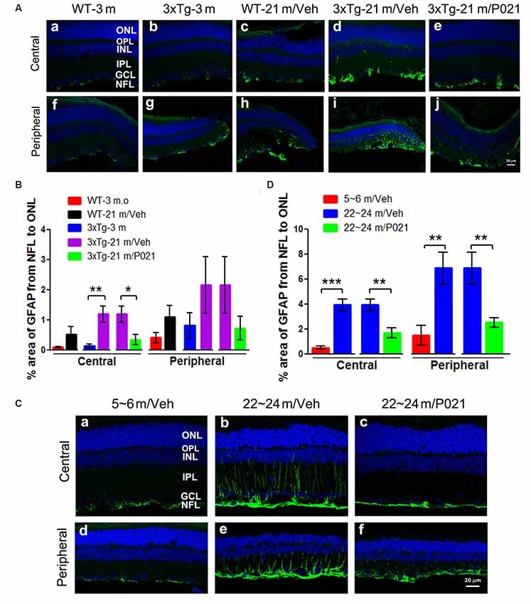 “To study the localization of astrogliosis and the response to P021 treatment in the retina of aged mice and rats, astrocytic/Müller cell activation was evaluated by immunostaining with anti-glial fibrillary acidic protein (GFAP).”“In contrast, the GFAP-positive staining was limited to the NFL and GCL in 3xTg-21 m/P021 mice (Figures 6Ae,j). The area percentage of GFAP from the NFL to the ONL in the central retina of 3xTg-21 m/Veh mice was significantly higher than in 3xTg-3 m mice and WT-21 m/Veh mice and was reduced by P021 treatment to the levels in WT-3 m/Veh and 3xTg-3 m/Veh mice (Figure 6B).”
