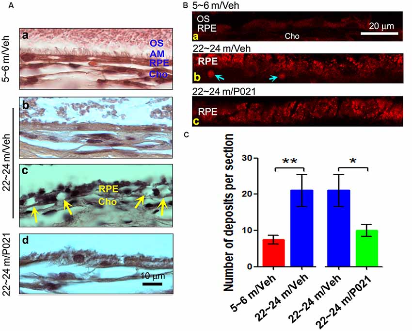 “Dysfunction of the RPE presages photoreceptor cell loss, and the histological abnormalities in RPE are also a hallmark of human dry AMD.”“To investigate the histopathological changes in rats, the RPE layer was examined in sagittal sections stained with H & E. Apical microvilli (AM) in RPE were apparent in ~5- to 6-month-old/Veh rats (Figure 2Aa); in contrast, they were shortened or disorganized in the ~22- to 24-month-old/Veh rats (Figures 2Ab–d), and P021 treatment showed improvement in the arrangement of AM. Additionally, many RPE cells were vacuolated (Figure 2Ac, yellow arrows), and RPE atrophy (Figure 2Ac, yellow RPE) was detected in aged rats, whereas no apparent abnormalities were observed in the RPE of ~5- to 6-month-old/Veh rats and ~22- to 24-month-old/P021 rats (Figures 2Aa,d). Furthermore, many lipofuscin granules (Figures 2Ac,Bb) and deposits (Figures 2Bb,C) were present between RPE and Cho detected by auto-fluorescence in ~22- to 24-month-old/Veh rats, whereas very few lipofuscin granules were detected in ~5- to 6-month-old/Veh rats (Figures 2A,Ba); lipofuscin granules and deposition number were markedly decreased in ~22- to 24-month-old/P021 rats (Figures 2Bc,C). These results suggest that ~22- to 24-month-old/Veh rats exhibit RPE abnormalities, and P021 ameliorates these pathological changes.”