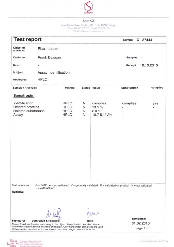 Our most recent result from SIMEC, verifiable on their website just like all the other previous tests they made was for our HGH ... such a long awaited test that wasn't done till now by many manufacturers.